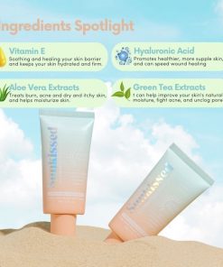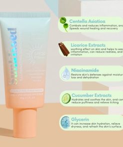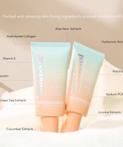 Aqua, Aloe Vera, Cucumber Extract, Glycerine, Avobenzone, Octocrylene, ethylhexyl methoxycinnamate, Polyacrylate Crosspikymer 1-1, Stearic Acid, Dimethicone, Cyclopentasiloxane, Sodium PCA, Hyaluronic Acid, Centella Asiatica, Green Tea Extract, Licorice Extract, Isopropyl Myristate, Niacinamide, peg-40 hudrogenerated castor oil, carbomer, hydrolyzed collagen, vitamin E, Phenoxyethanol and Ethylhexylglycerin