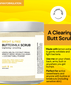 BRIGHT & FREE BUTTERMILK SCRUB is a clearing butt scrub coupled with lemon extract to gently exfoliate and fight bacteria. Removes dirt, sweat, and bacteria so you can stop giving a zit about butt acne.