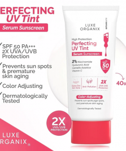 Luxe Organix Perfecting UV Tint Serum Sunscreen SPF 50 PA +++ 40mLÂ is a lightweight and non-sticky tinted hybrid sunscreen with SPF50 PA+++ UVA.UVB broad spectrum protection. With its advanced color-adjusting formulation, this tinted sunscreen evens out the skin tone and instantly brightens the complexion, while protecting the skin against external pollution.