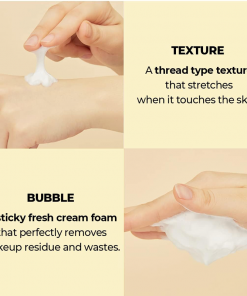 This product has a thread-like texture that stretches when touching the skin and bubble cream foam that removes impurities and makeup.